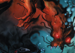 La première chose qu'il vit fut une créature grotesque, faisant facilement deux cents pieds de haut, ressemblant à un croisement entre un orc et les vers géants et gluants à griffes que les mineurs Onu-Matoran avaient rencontré par le passé. Ça ne ressemblait à rien de ce qui avait jamais arpenté les mers de Metru Nui ou n'importe quel autre endroit où les Matoran avaient habité. La créature était ancienne quand le monde était nouveau, une relique d'un temps passé, lorsqu'il était petit par rapport à ses congénères.