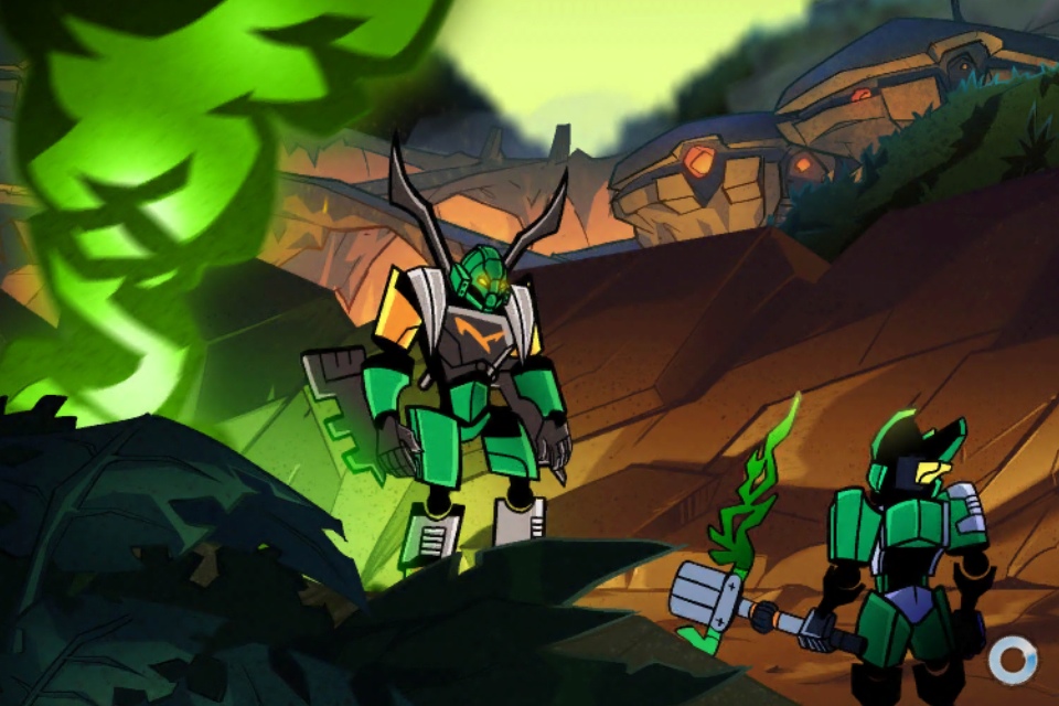 Description Un des écrans de chargement de BIONICLE : Mask of Creation, montrant l'arrivée de Lewa sur Okoto.