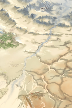 La source de cette rivière est située dans les Montagnes du Pic Noir. Elle s'écoule dans la Mer de Sable Liquide, et sépare les Dunes de la Trahison du Canyon de l'Effroi. Les Skrall ont construit un barrage sur la rivière, faisant que seul un filet d'eau continue à s'en écouler. De nombreuses tribus ont combattu dans des Combats d'Arène pour posséder le barrage, mais toutes ont échoué à le prendre aux Skrall.